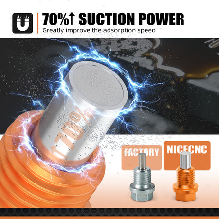 Up to 70% stronger magnetic force compared to OEM plugs, thanks to high-quality neodymium core material. This dramatically increases the ability to attract and hold onto steel and iron particles.