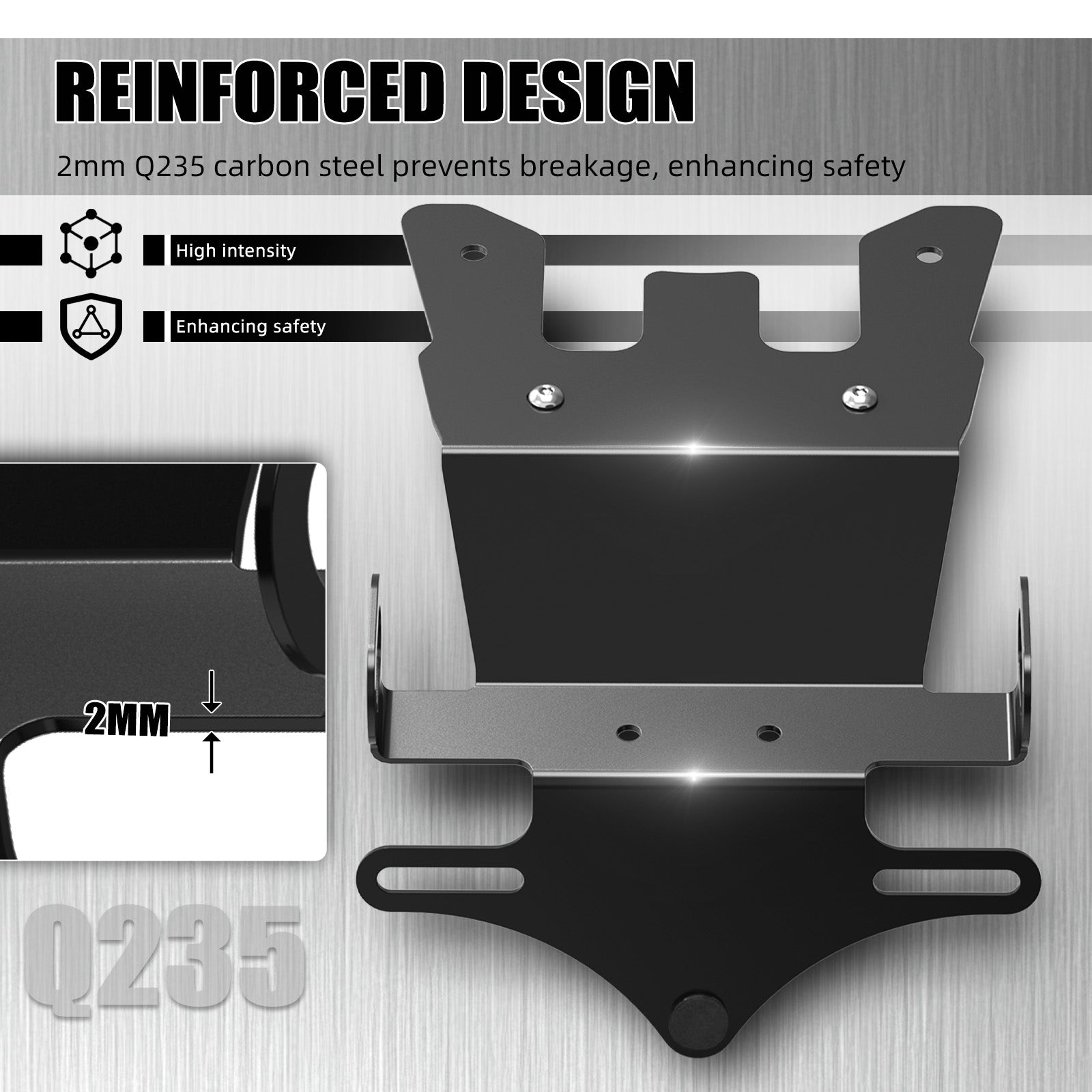 Constructed with 2mm Q235 carbon steel and a reinforced bracket structure to prevent the license plate from breaking due to vibrations or oscillations, thereby enhancing safety.