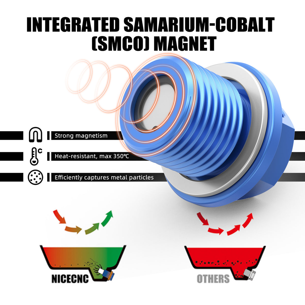 -- The oil drain plug features built-in samarium cobalt magnets to capture unwanted metal impurities and particles that the engine oil filter cannot catch.