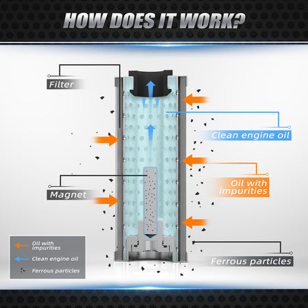 【Magnetic Filter Core】 Ingeniously designed with a magnetic filter core in the middle, continue filtering the oil and trapping any iron or other (ferrous) particle.