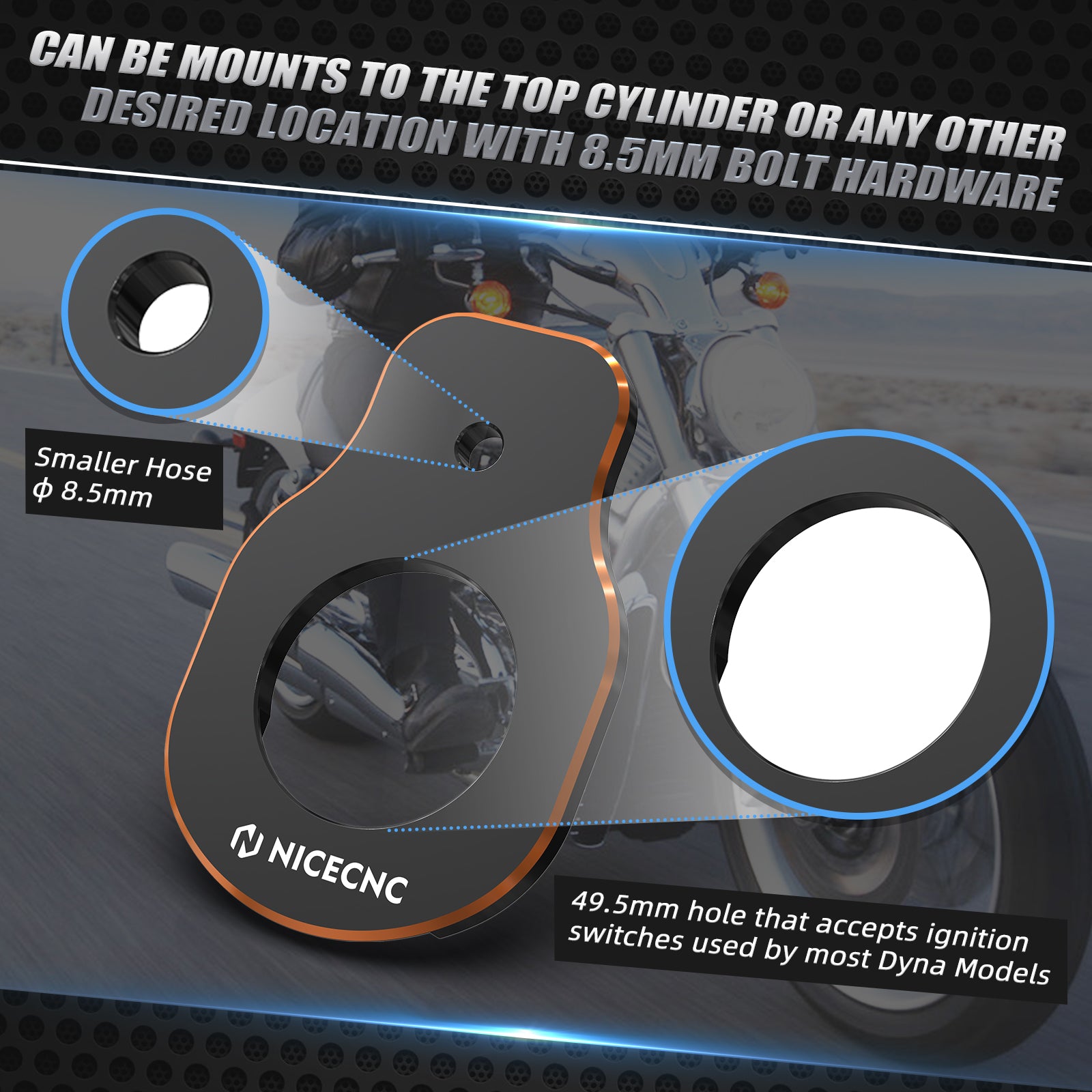 1.95"(49.5mm) hole that accepts Dyna ignition switches