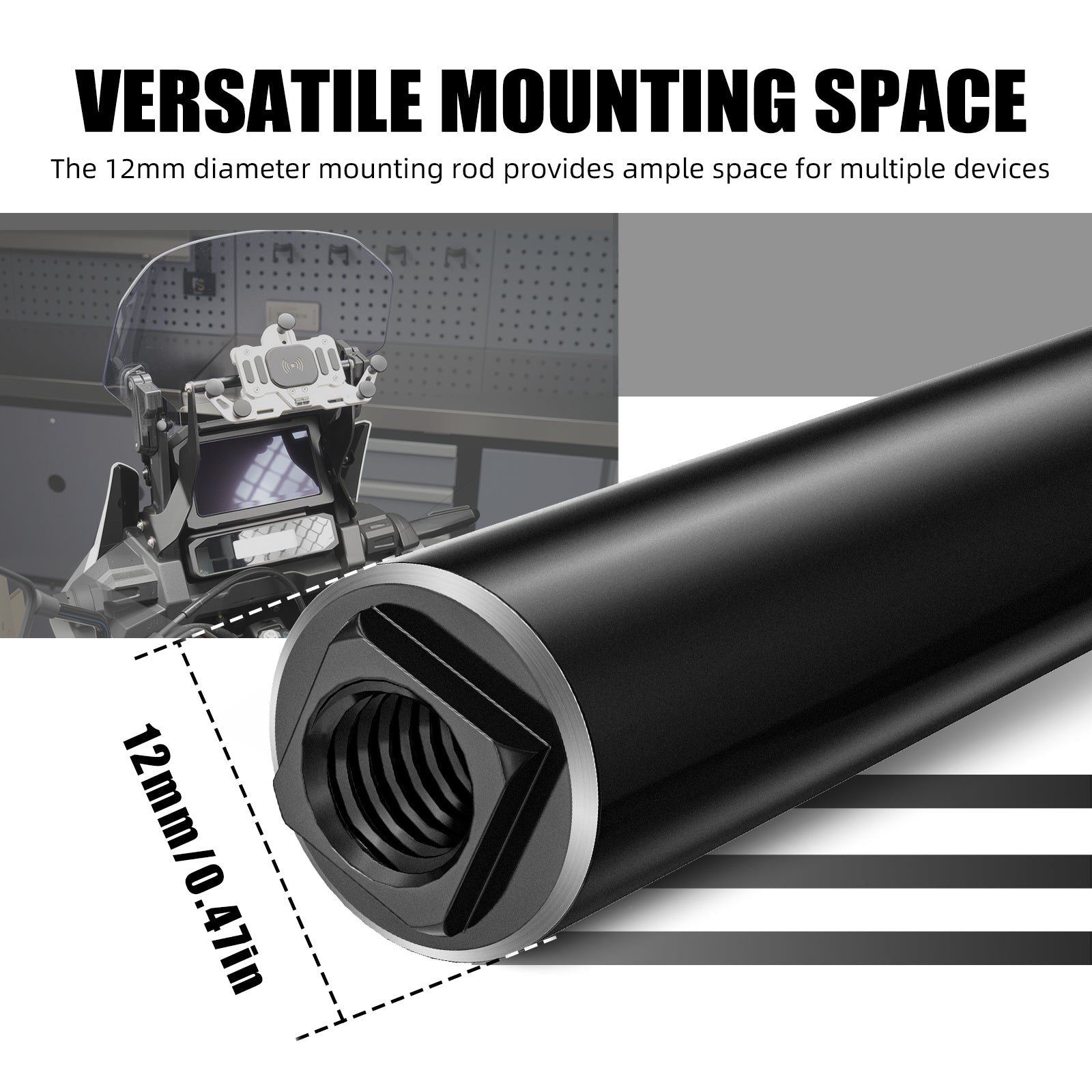 【Versatile Mounting Space】12mm rod allows multi-device installation, accommodating diverse functional needs easily.These include Garmin and QuadLock mounts, as well as most phone mounts.