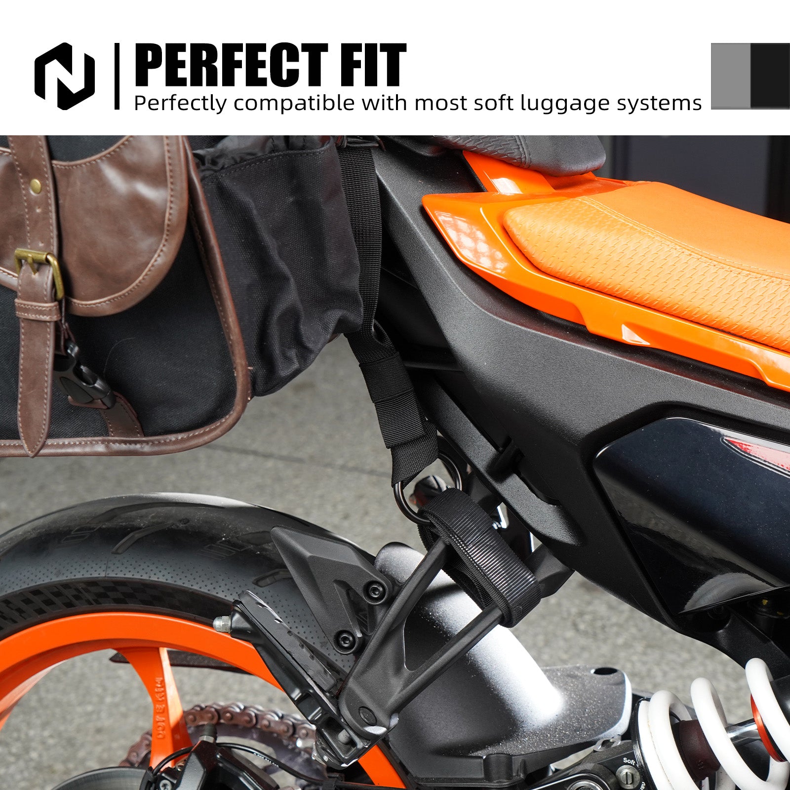 The strap fits snugly without damaging the bike's paint. It can be installed near the pedals or under the rear seat, staying firmly in place without affecting the exhaust or cable routing.
