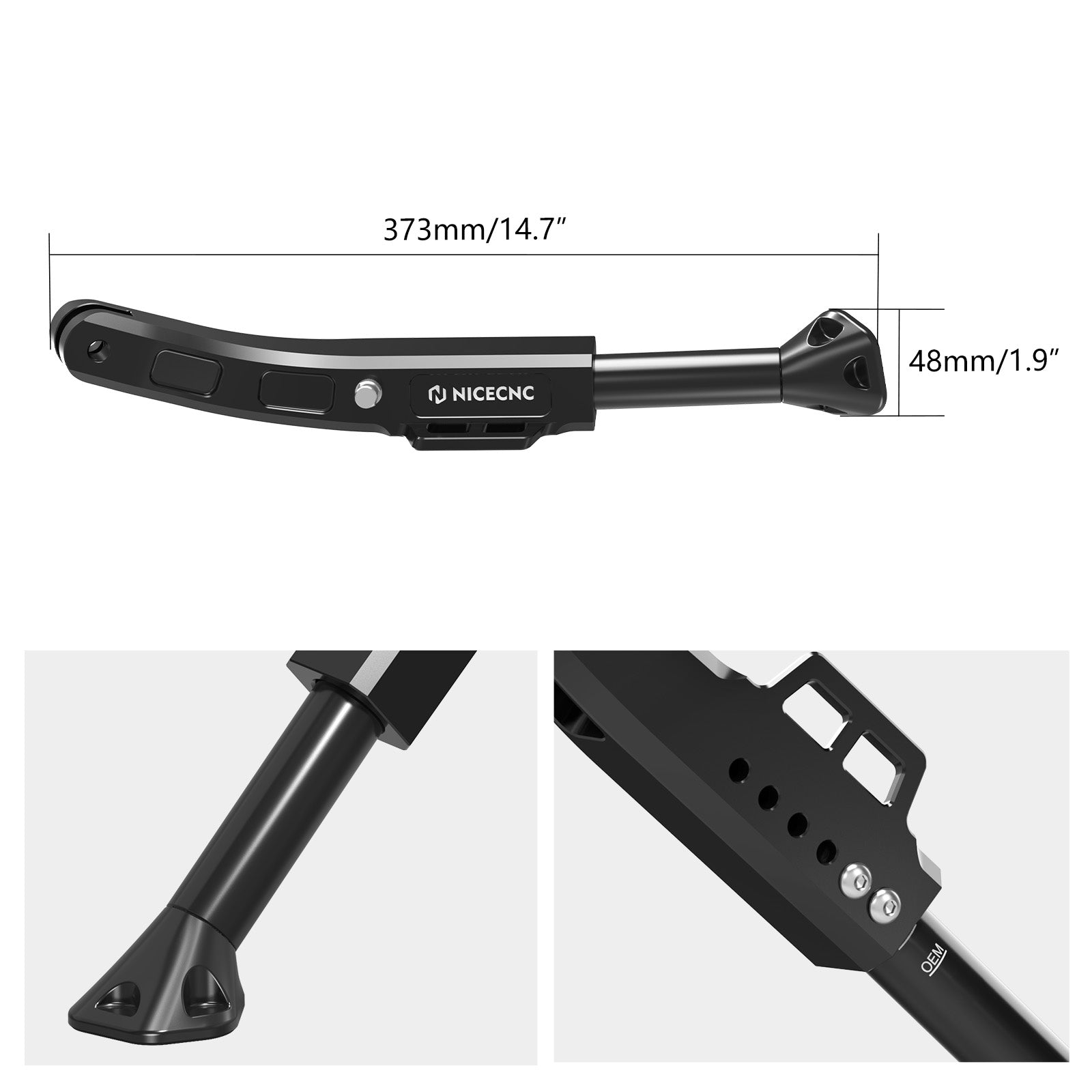 The adjustable kickstand can be set to standard, raised, or shortened lengths, allowing you to create your ideal lean angle regardless of suspension height or the amount of gear on your KTM/HQV/GG 690/701/700. Whether your vehicle has been lowered or lifted through aftermarket suspension mods, this kickstand ensures stable parking and proper lean angle. The NICECNC Adjustable Height Side Stand serves as an excellent replacement for damaged OEM kickstands and helps prevent embarrassing roll-overs. Added a side stand foot peg with an innovative design to address the common issue of hard-to-reach kickstands. Even when wearing riding boots, this peg allows easy deployment of the kickstand. The stand includes a 53x48MM foot pad, allowing the bike to be safely parked on soft or uneven surfaces.