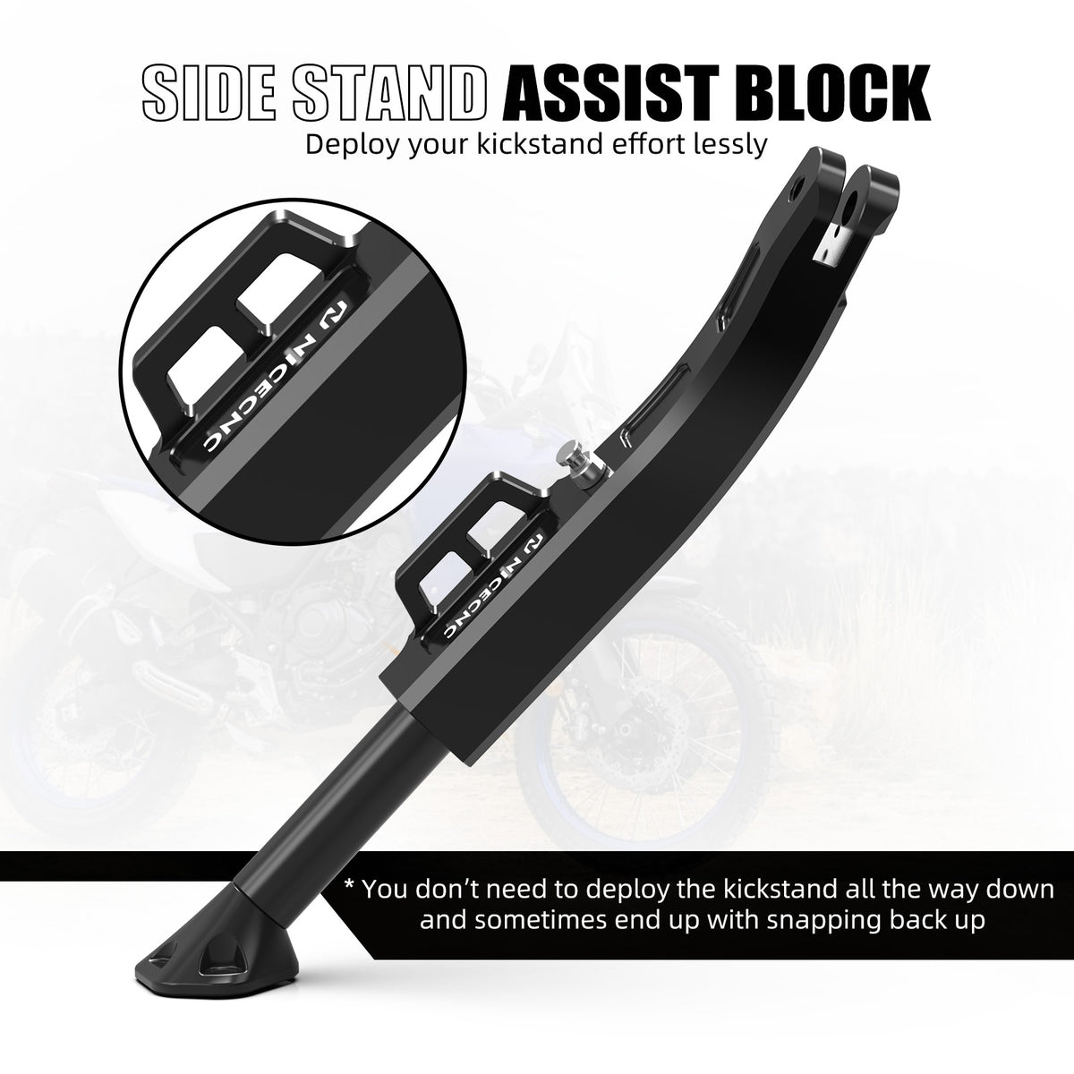 【 Side Stand Assist Block 】 Helps the driver deploy the side stays more easily that don’t have to extend nearly as low/far to deploy the kickstand all the way down.