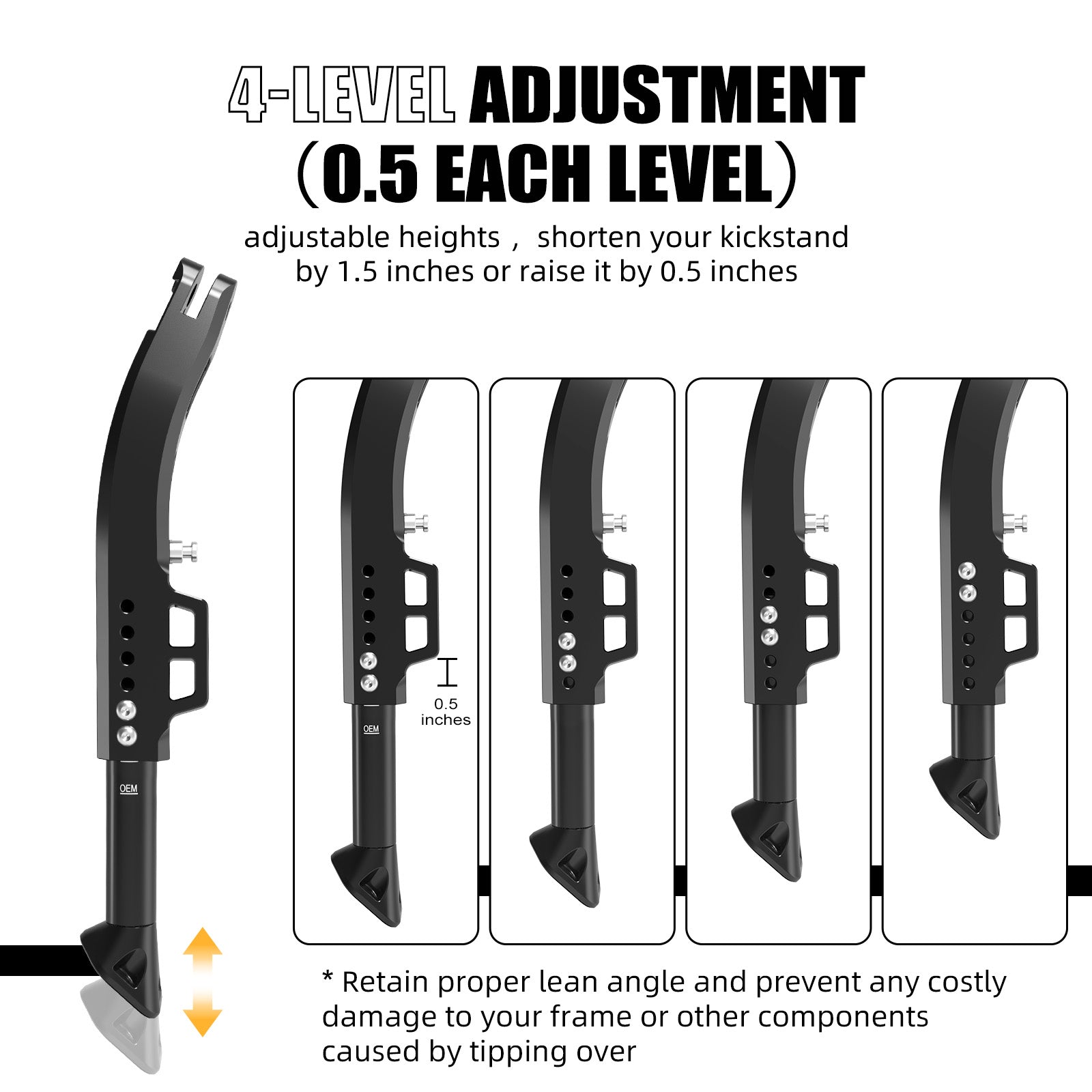 【4-level Adjustment 】 Adjustable heights(0.5 inches each level ), Allow you to shorten your kickstand by 1.5 inches or raise it by 0.5 inches by loosening the locking bolts to install it. Retain proper lean angle to prevent tipping over.