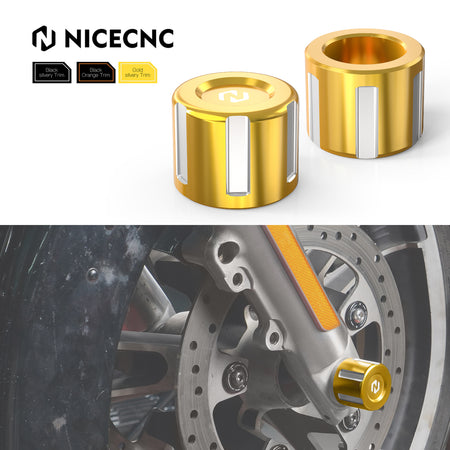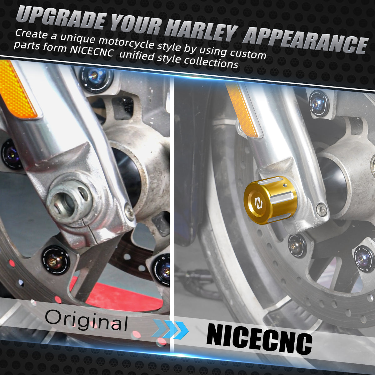NICECNC brand new front axle nut covers was made of aviation-grade 6061 aluminum alloy, which protect front axle hardware from dirt, moisture, dust and other outer damages.The anodized surface treatment enhances the appearance texture, prevents corrosion and rust. The process is CNC-milled and customized for Harley motorcycles to match the overall style. Sold in pairs , available in 3 colors. New style, upgrade your Harley Front end appearance, and create your unique motorcycle style.