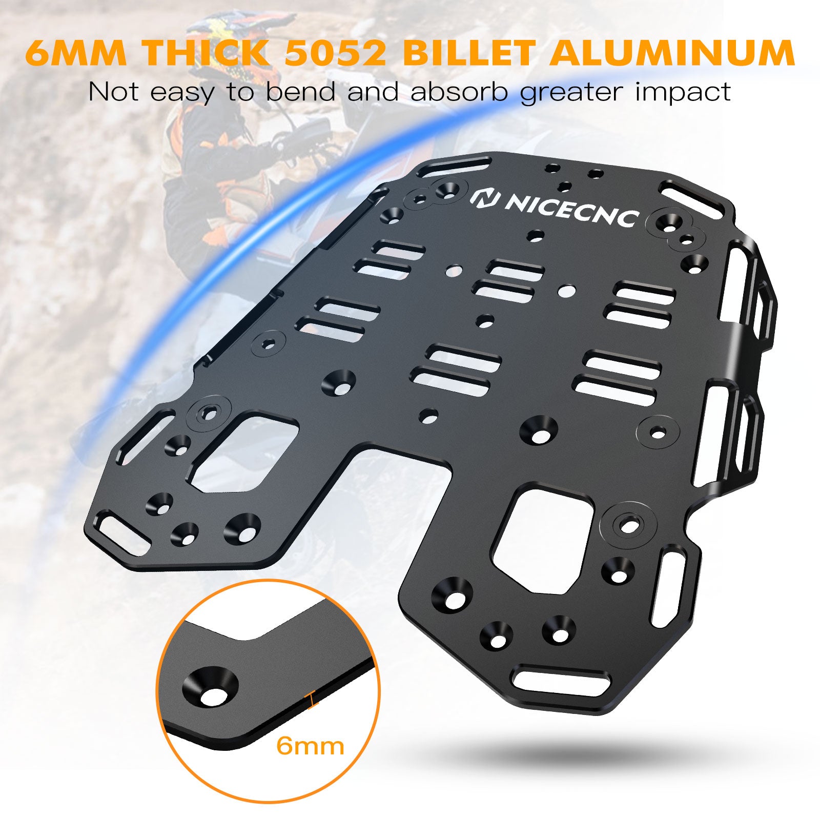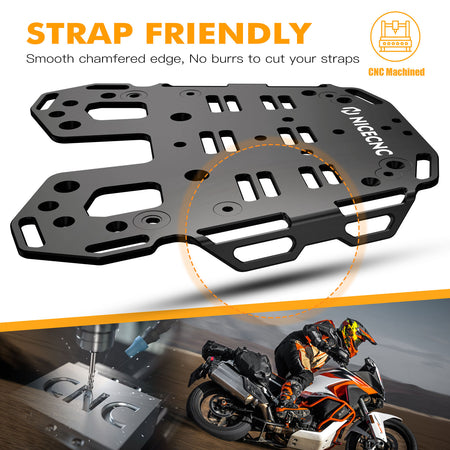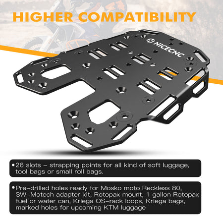 【Rack Compatibility】26 slots - strapping points for all kind of soft luggage, tool bags or small roll bags. pre-drilled holes ready for Mosko moto Reckless 80, SW-Motech adapter kit, Rotopax mount, 1 gallon Rotopax fuel or water can, Kriega OS-rack loops, Kriega bags, marked holes for upcoming KTM luggage. Please note the above compatible luggage, bags, mounts and water can are not included.