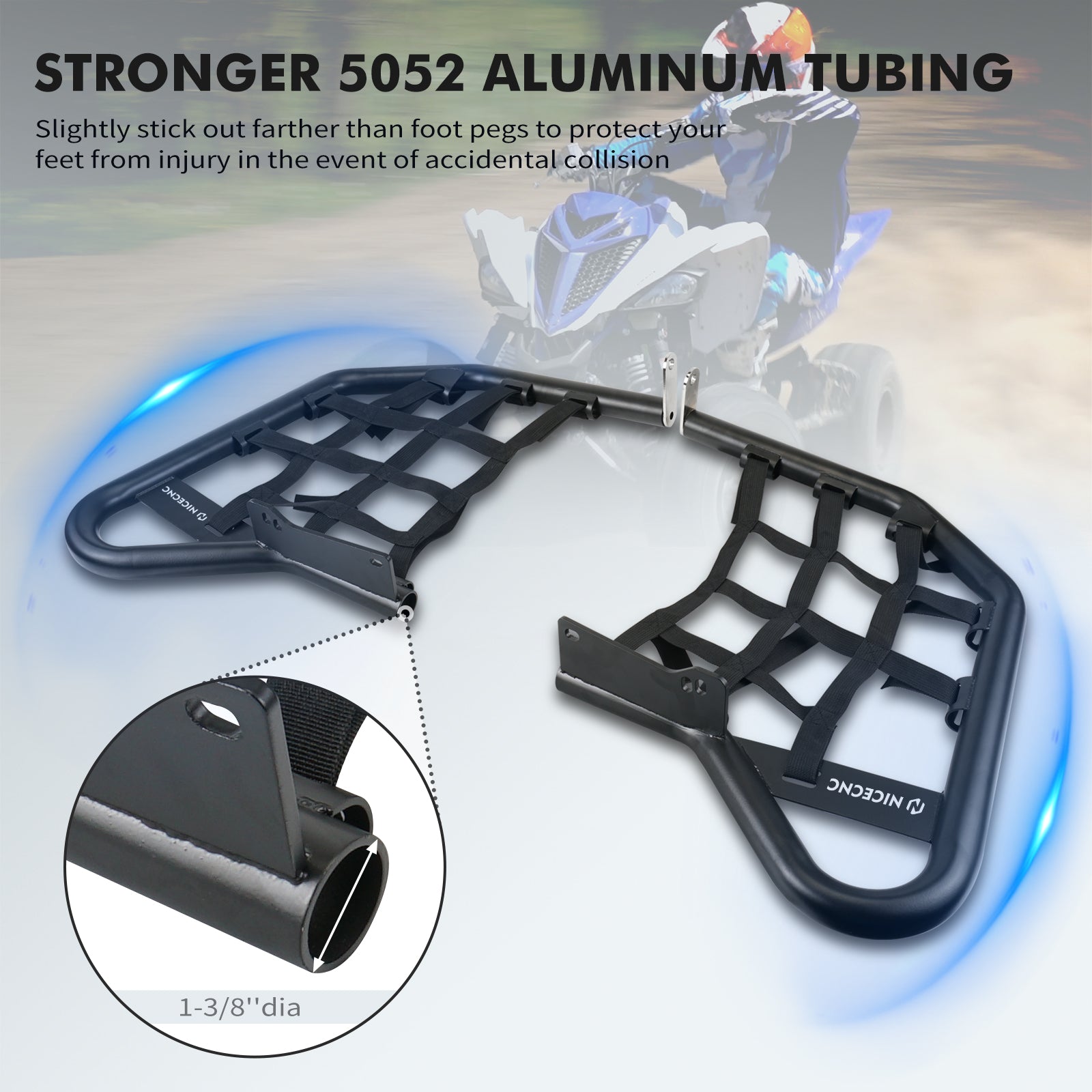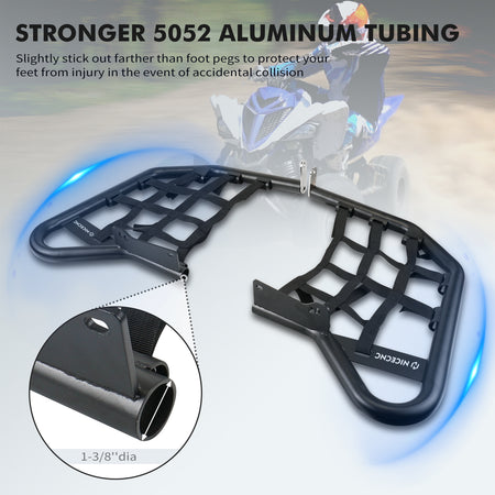【Stronger 5052 Aluminum】The 1-3/8'' diameter tubing is upgraded to premium 5052 aluminum for extreme strength. The nerf bars stick out slightly farther than foot pegs to protect your feet from injury in the event of accidental collision.