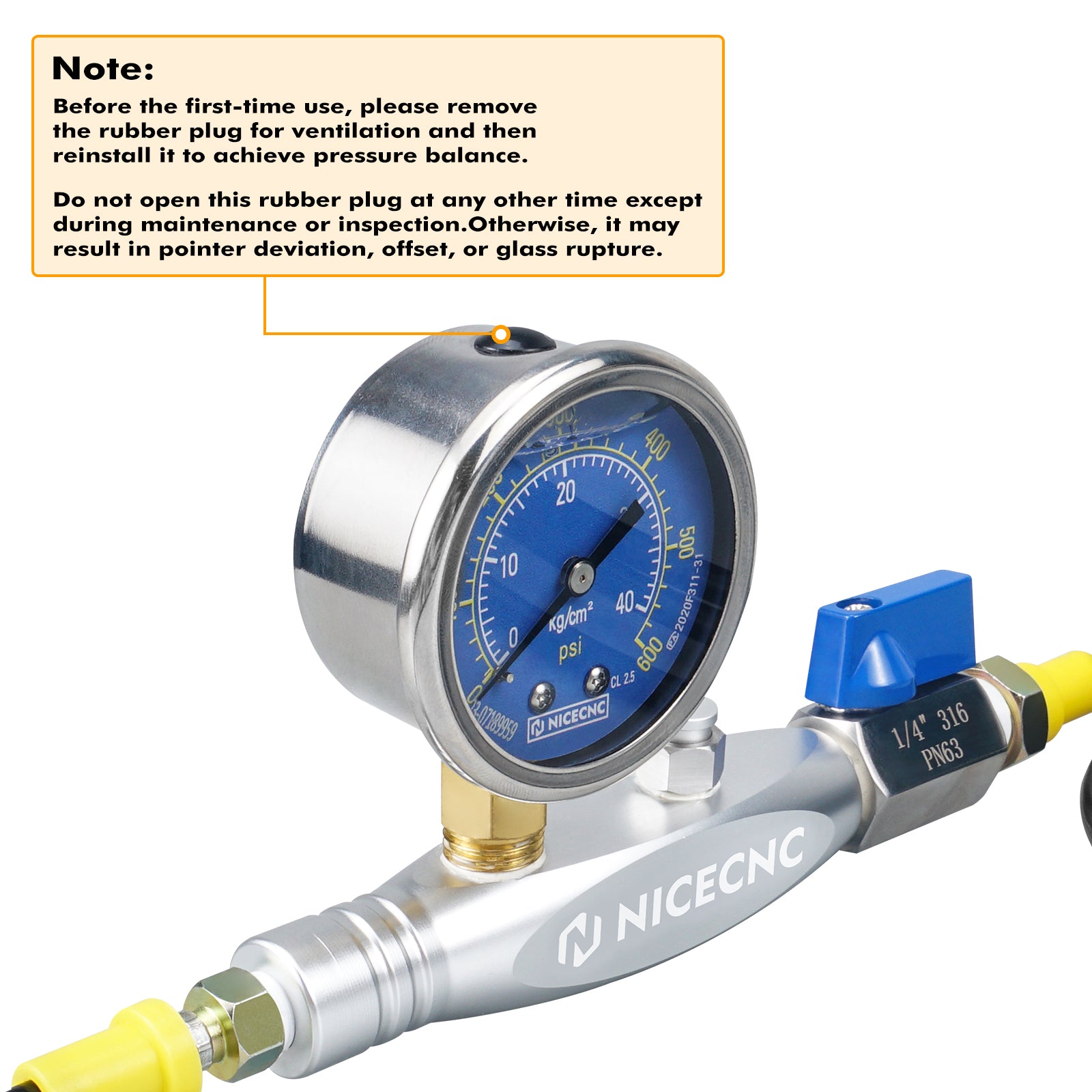 Before the first-time use, please remove the rubber plug for ventilation and then reinstall it to achieve pressure balance. Do not open this rubber plug at any other time except during maintenance or inspection.Otherwise, it may result in pointer deviation, offset, or glass rupture.