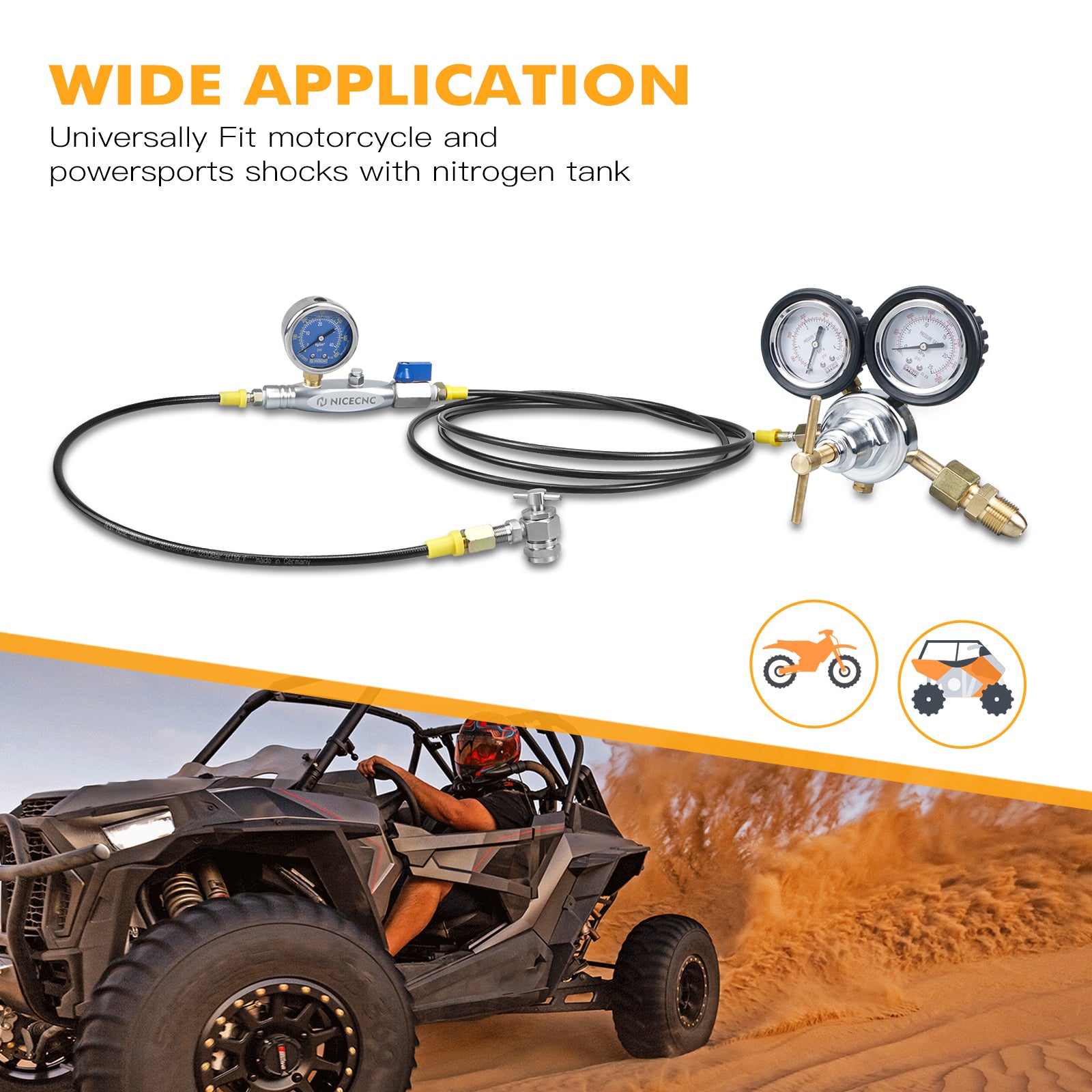 Universal for Nitrogen Filled Shock with schrader valve, like off-road bike, ATV, UTV and cars.