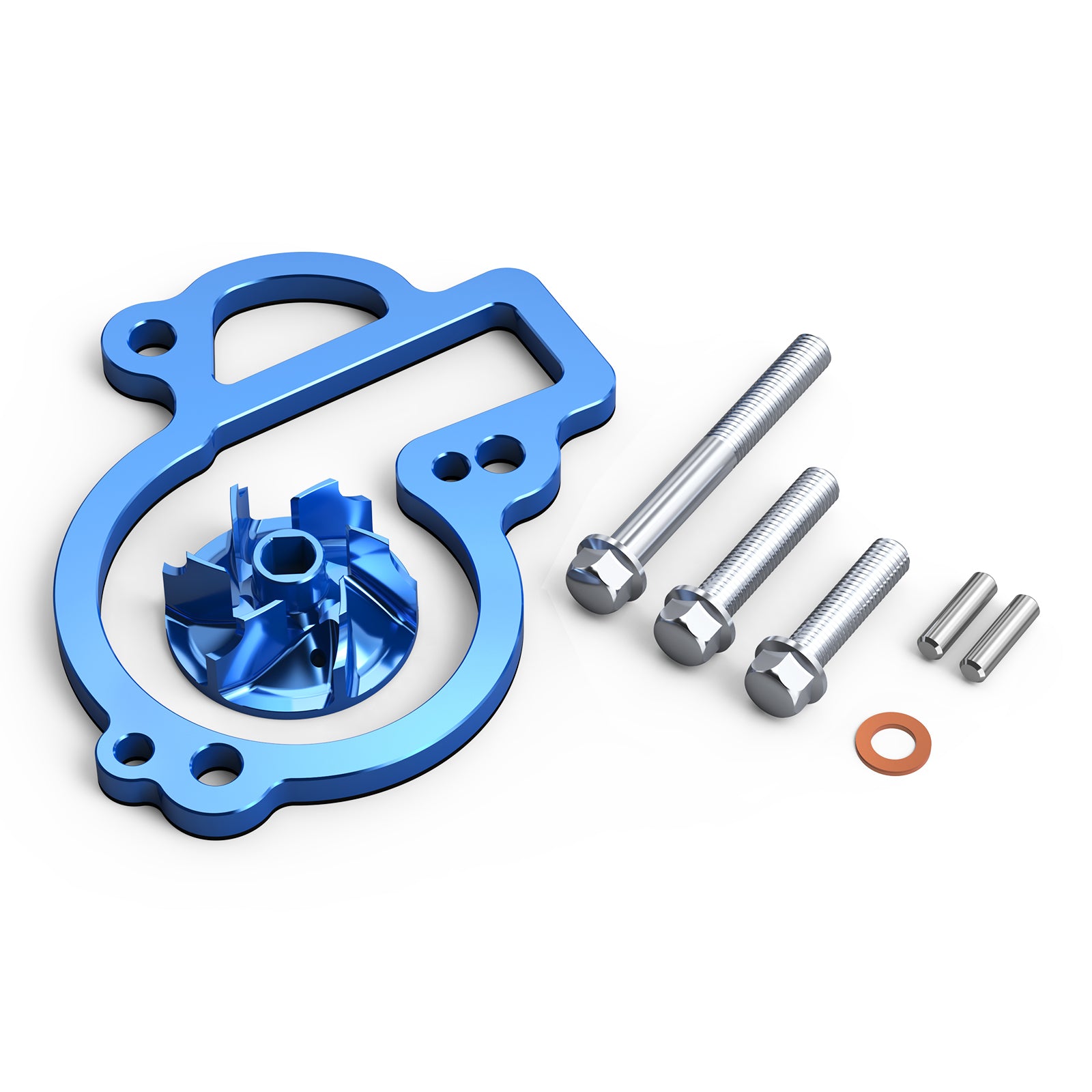 By enlarging the impeller blades, this product allows more coolant to pass through the water pump, resulting in faster cooling. At the same engine speed, the flow speed of the coolant increases, making the temperature of the coolant 10 to 15 degrees lower than the standard temperature, thereby optimizing the performance of the vehicle. Additionally, aluminum spacers increase the total amount of coolant that can pass through the water pump, improving heat exchange. The product is made of high-quality 6061-T6 aluminum, which has light weight and excellent hardness to keep the weight as low as possible. Cutting-edge anodizing keeps the product in its original look and enhances the bike's racing character. The products are manufactured with the latest CNC technology, which ensures the precision of each cut part and facilitates installation. This product is designed and built to provide optimum cooling and durability so your bike will perform at the race level or on a daily basis.