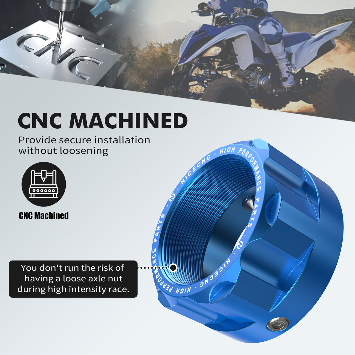【CNC Machined】Machined by the latest generation CNC technology that ensures secure installation. You do not run the risk of having a loose axle nut during high intensity race.
